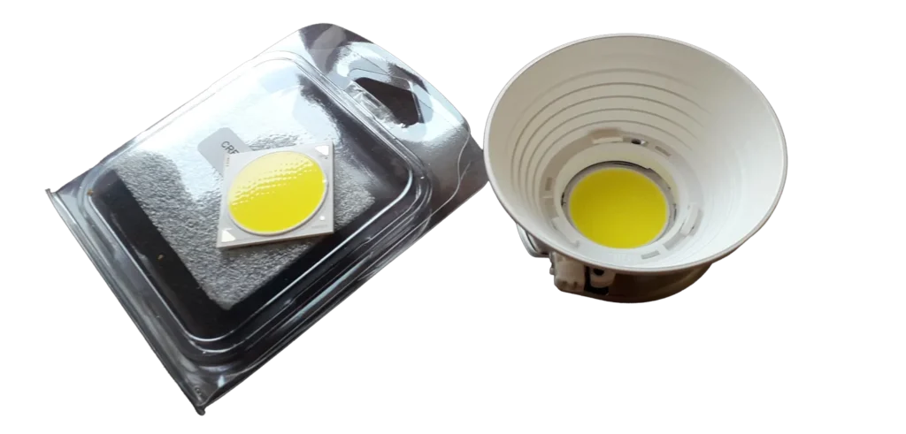 While searching for high-power LEDs with a high color rendering index (CRI), I stumbled across Cree’s COB LEDs, namely the XLamp® CXB3590. These produce around 15,000 lumens at their maximum power of 106 watts and, depending on binning, are available with high CRI values. Two of them would generate around 30,000 lumens, more than enough to light up the night.