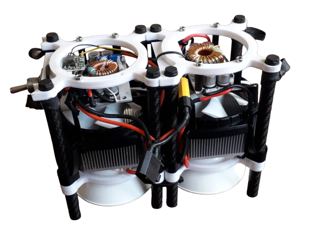 For each module I designed two 3D-printed parts that were connected via 10mm carbon fiber tubes. At the very top you can see the boost-converters that push the drones battery voltage of 14.8 Volts to the 36 Volts required by the LED’s. A step-down converter to 12 Volts is also necessary to feed the fans cooling the aluminium heatsinks, it is mounted on the left module. Both modules are connected via zip ties, the 3D-print is appropiatly formed to further strengthen the bond. A switch for deactivating the unit during ground tests rounds off the package. The entire bundle is attached to the drone using sturdy rubber rings that get connected to carbon fiber tubes at the belly of the drone.