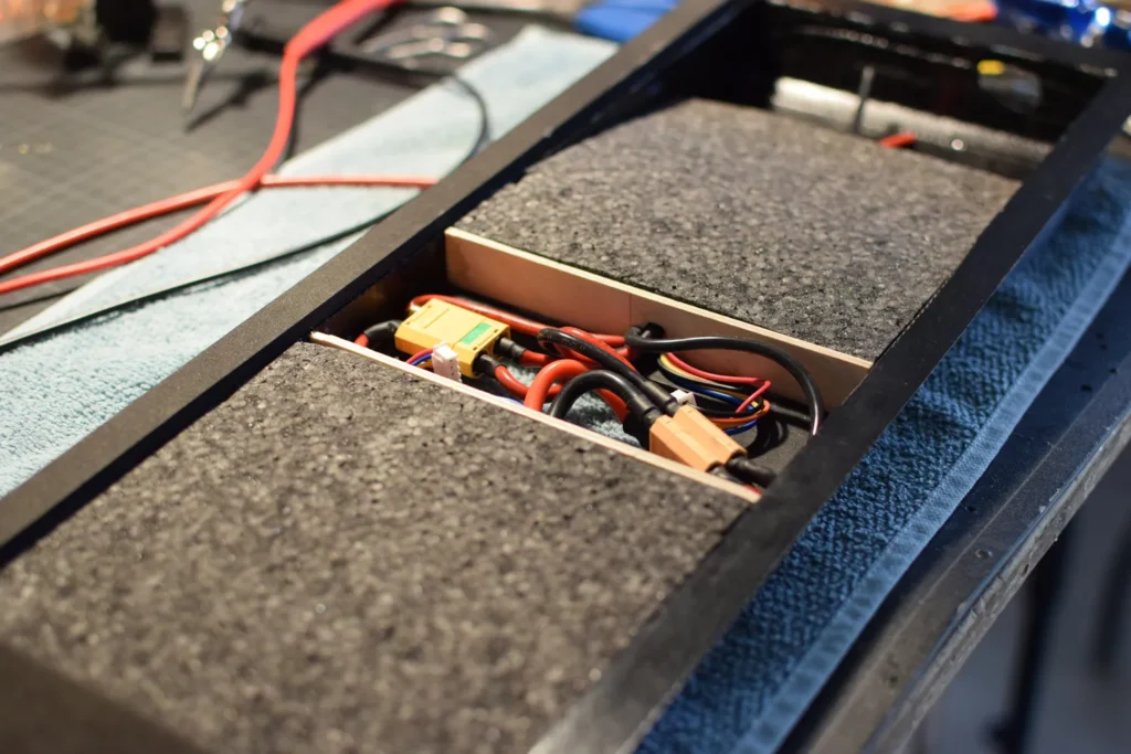 The batteries were attached to the housing with a long strip of Velcro tape. To reduce the impact of strong vibrations on the electronic components and battery during operation, the housing and battery was decoupled from the deck of the longboard using a 5 mm thick strip of neoprene. The whole assembly was then attached with rubber-mounted screws.