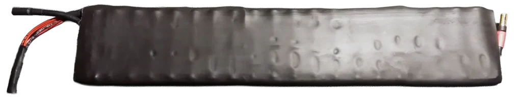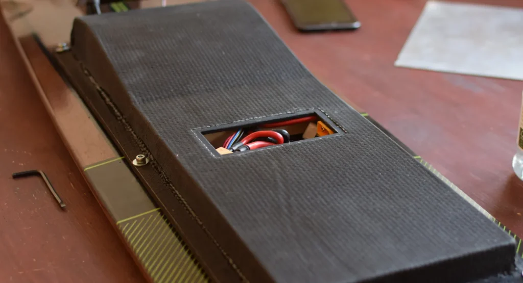 The first version was designed to house 32 NCR-18650PF battery cells and Benjamin Vedder’s VESC brushless controller. A cover in the middle of the housing provided access to the connections of the two-part battery system. Due to a lack of experience, I made an undesirable design choice regarding the 90° angle at the transition from the housing to the lip, which was intended for attachment to the longboard itself. Despite the vacuum, the fiberglass fabric was not completely pressed into the rectangular shape, which was certainly also due to the use of inflexible garbage bags instead of vacuum bags. Not ideal, the finished housing still fulfills its purpose years later.