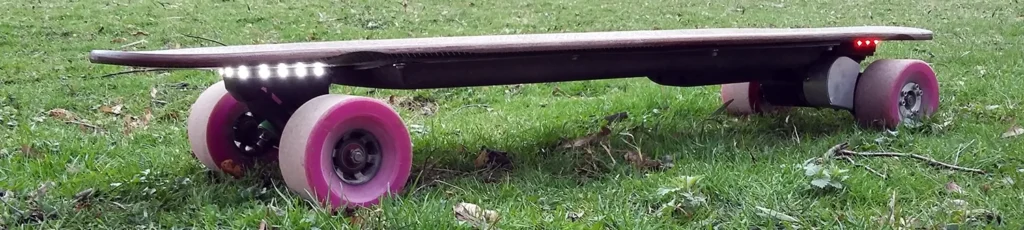 The new design underwent fundamental changes: a battery management system was integrated, and the built-in balancer allowed the longboard to be “refueled” with a small, commercially available charger. The battery itself was designed in two halves as separate units that were no longer permanently mounted to the housing and could therefore be replaced. They are pressed from the housing to the underside of the longboard, all in a sandwich construction, so to speak. Avoiding right angles in many places on the housing ensured a cleaner finish and a professional look. The use of heavy fabric increased the mechanical stability of the construction. Ventilation openings that could be closed in the rain allowed for better thermal management of the brushless controller, which was pushed to its performance limits in this version.